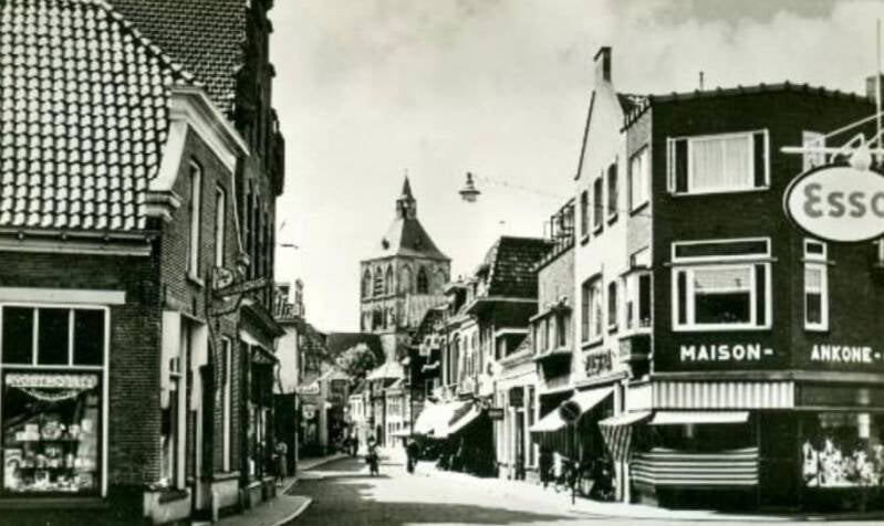 Links een sigaren- en sigarettenzaak, daarna werd het pand verbouwd en kwam er Modezaak Reuver-Spit in. l. Rechts zie je nog net Esso het tankstation van garage Oude Monninkhof. Foto Peter Van Halteren in Oud Oldenzaal