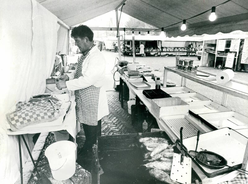 Hier zien we Harry Ophuis op de markt. Zijn winkel stond op de Hoek Poortstraat - Bisschopstraat- Oostwal. Op de gevel van zijn winkel stond : Eet Haring Bij Ophuis" (EHBO).