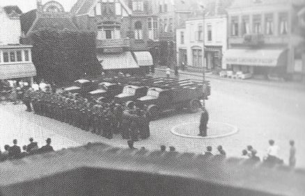 Duitse militairen met hun voertuigen op de Groote Markt.