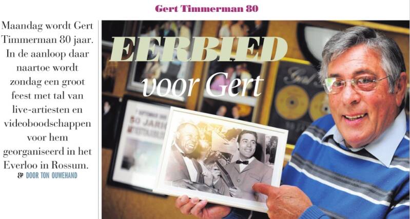 7 juni 2015: Twentsche Courant Tubantia: Wat een eerbetoon voor de bijna 80-jarige Gert Timmerman. Ben Cramer, Ben Zwiers, Janneke de Roo, Henny Thijssen en Fred en Heleen 'Golden' Gaasbeek; ze waren er allemaal voor de zanger die om middernacht tachtig werd. Het verrassingsfeest, dat geïnitieerd werd door Oldenzaler Rob Leijdekkers, was een schot in de roos