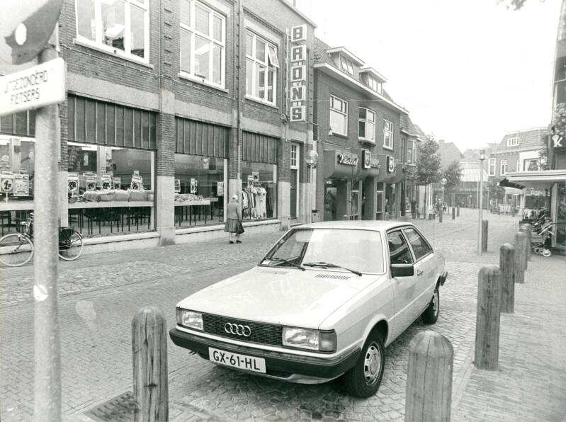 1980: Begin van de Grootestraat, links Brons Textiel en rechts Heijne schoenen, waar nu Setso is gevestigd.