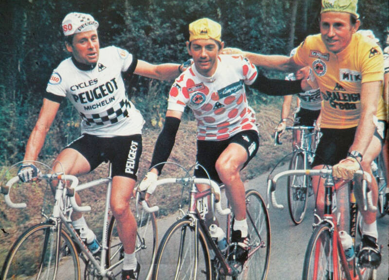 1980: Eindklassement Tour de France: Winnaar Joop Zoetemelk, tweede Hennie Kuiper en derde in het midden Raymond Martin, tevens winnaar van het bergklassement