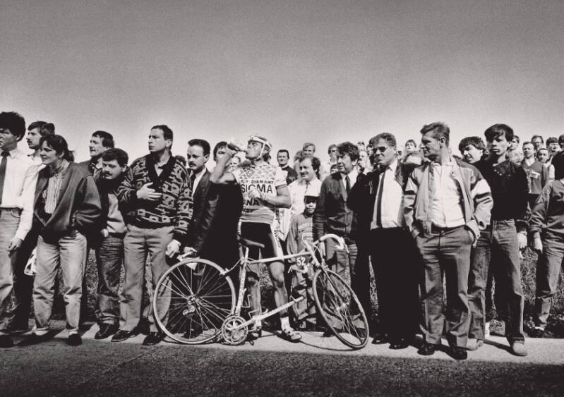1988 De ronde van Vlaanderen. Hennie is door zijn fiets gezakt en wacht op vervanging (Foto: Klaas Jan van der Weij)