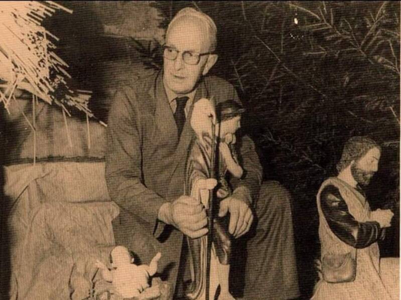 Koster Jan Muller bij de kersstal in de Plechelmusbasiliek (Foto van Jan Nijkrake in Oud Oldenzaal)
