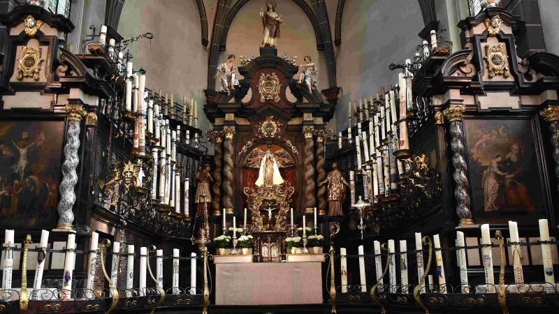 Het Genadebeeld, De Genade kapel en Maria Basiliek en het Hoogaltaar van de Kaarsenkapel (Foto van Paul Hermans in Wikipedia)
