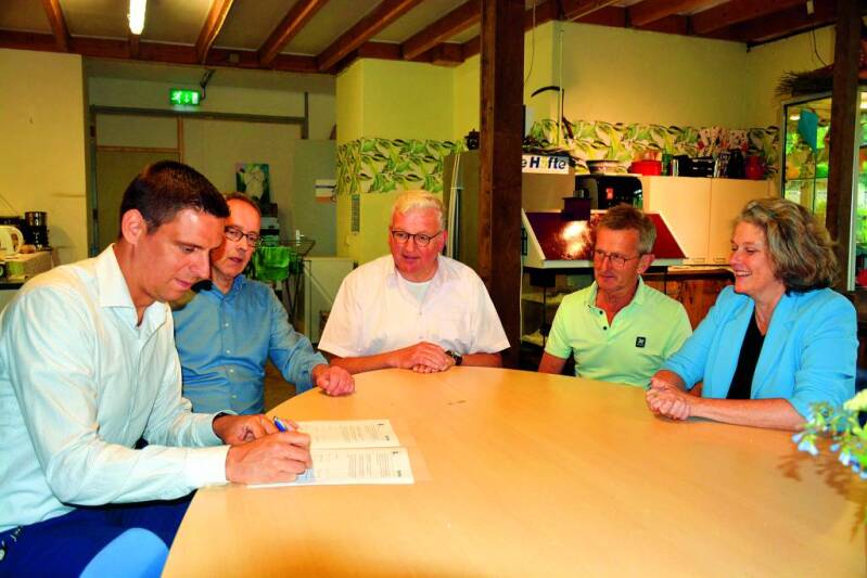 Aanwezig bij de ondertekening: Gijs Tiebot, Guus Bekhuis en Patricia Bleeker namens de gemeente. Namens de Höfte: Hans oude Hengel en Jan Lammerink. (Foto De Glimlach van Oldenzaal week 21-2024)
