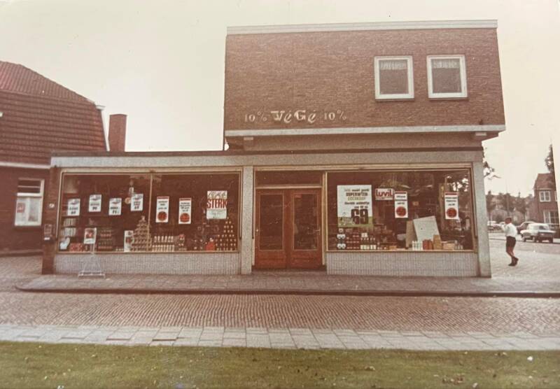 Tweemaal de VéGé winkel van Herman en Jan Franke aan de Huurnestraat, eerst als toonbankwinkel, later als zelfbediening.