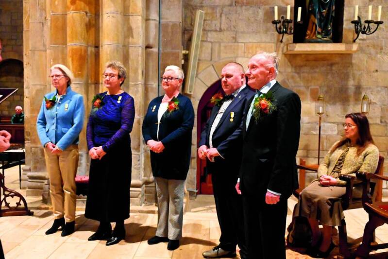 Het Oldenzaals Latijns Basiliek Koor vierde zondag 10 november 2024 zijn Ceciliafeest. Tijdens de plechtige hoogmis werden de versierselen uitgereikt van de Nederlandse Sint Gregorius Vereniging aan de dames Marian Leerkotte, José Laarhuis, Marijke Westerbroek en dhr. Jan Groot Kormelink, allen zestig jaar bij het koor, en aan dhr. Jan Hoveling, vijftig jaar bij het koor. ( Foto: De Glimlach week 47)