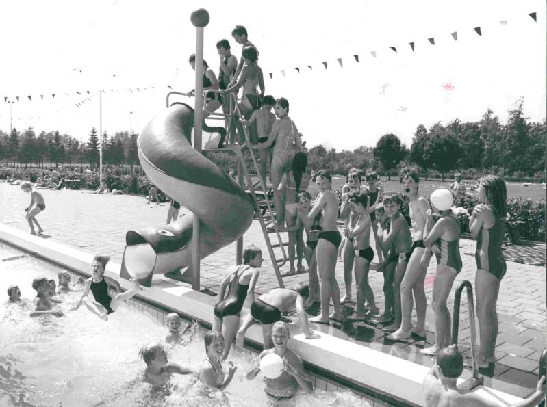 4 juli 1993 Veel belangstelling voor de nieuwe glijbaan (copyright: fotoarchieftwente.nl )