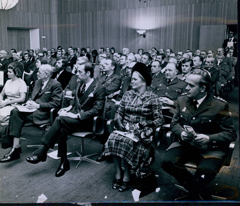 29-11-1973 Opening nieuwe politiebureau. Genodigden luisteren aandachtig in de raadszaal van het stadhuis. Op de eerste rij o.a. de Gaay Fortman en burgemeester van Reijnen