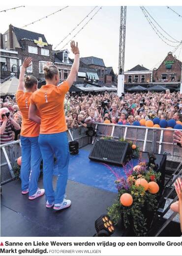 TC Tubantia 27 augustus 2016 In een open auto en voorafgegaan door de muzikanten van de plaatselijke korpsen, zijn ze met vader Vincent en moeder Gemma vanuit hun huis naar hartje Oldenzaal gereden. Het is door de grote belangstelling een triomftocht, maar eenmaal op de Groote Markt barst het feest echt los. Sanne en Lieke Wevers kijken met ongeloof over het horecaplein onder de Plechelmustoren. Duizenden Oldenzalers zingen de turntweeling toe. Olympisch kampioene Sanne is de eerste die zich herpakt. "Wauw, dank je wel. Dit is echt onvoorstelbaar." Als Lieke door ceremoniemeester Marga Bult de microfoon wordt voorgehouden, stamelt ze: "Jemig, moet je kijken. Hartverwarmend!"