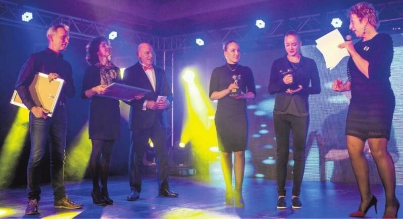 De familie Wevers vormde het stralende middelpunt tijdens de sportverkiezing van Oldenzaal. Ook turncommentator Hans van Zetten was erbij. (FOTO ROBIN HILBERINK)