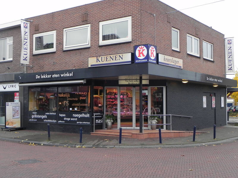 Je zou niet verwachten dat hier een slagerij was gevestigd, maar toch verkocht v.d.Lied jarenlang hier zijn vlees en vleeswaren. Ondanks dat het interieur in de winkel nog alles doet denken aan een slagerij is hij al jaren gesloten.