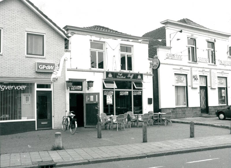 Steken we straat over dan zag het na het ROC het er zo uit, met in het midden café Toff, daarna Grösmeijer en Gait in 't Hek. Rechts het p[and waarin Sporting Centre Oldenzaal in was gevestigd.
