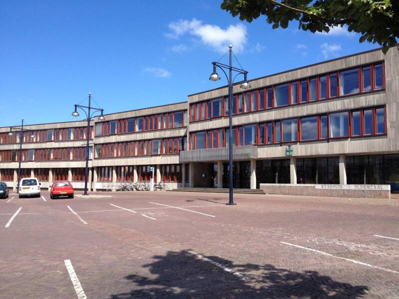 Het stadhuis met ervoor de parkeerplaatsen op de Ganzenmarkt