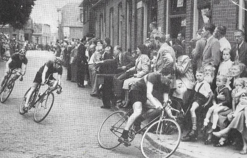 1949 Eerste ronde van Oldenzaal tijdens de eeuwfeesten. De eerste drie renners, Henk Schepers, Raeke en aan kop Bob Haverkamp, in de Hofmeyerstraat.