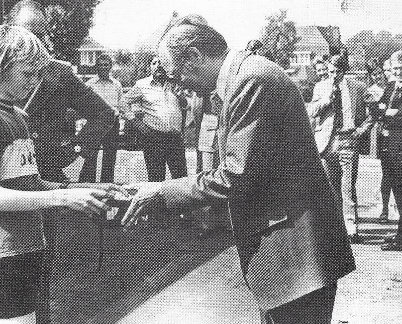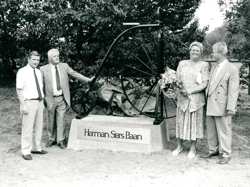 3 juli 1992 officiele opening van de Herman Siers Baan. Vanaf links: Gedeputeerde Dijkema, Herman Siers en zijn vrouw en voorzitter OWC Olde Damink.