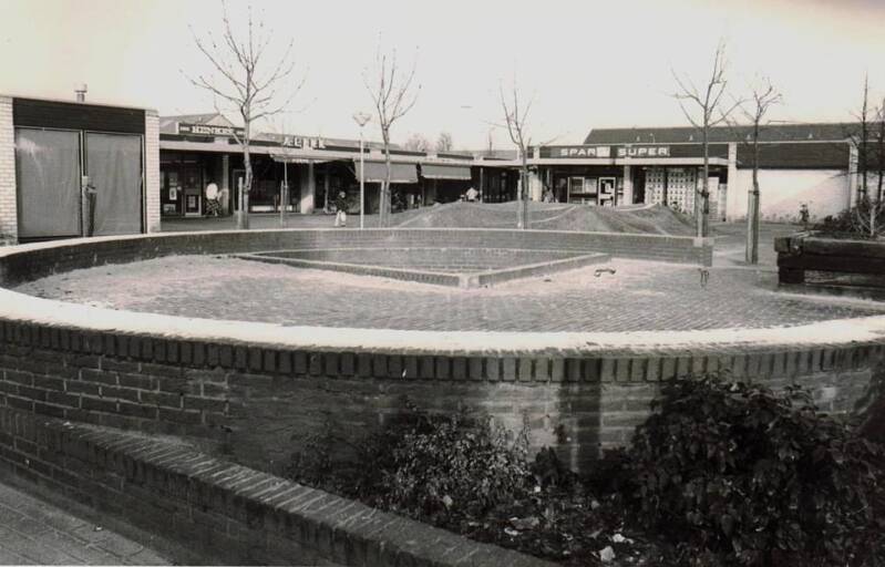 1978 : We zien dat er toen nog een slagerij, naast drogisterij Henny Riekhoff was. Ook was er de supermarkt van de Spar, later C1000 en nu Albert Hein. In het midden van het plein het kunstwerk "De Theedoek" van Sjef Sales. het kunstwerk ligt nu op de rotonde van de Schipleidelaan.