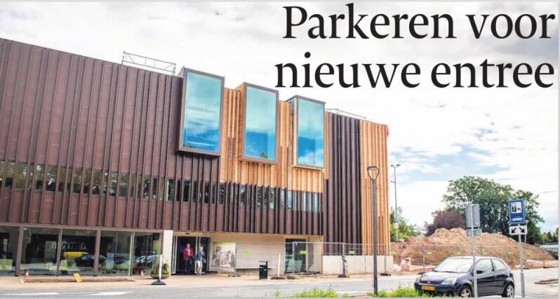 11 augustus 2016 TC Tubantia: Bezoekers van de polikliniek kunnen sinds deze week gebruikmaken van de nieuwe hoofdingang en parkeerplaats (met uiteindelijk 142 plaatsen). Nog even en de complete voorgevel is van zink voorzien.